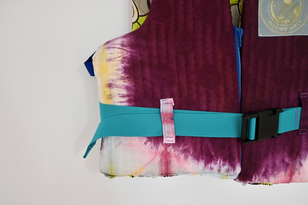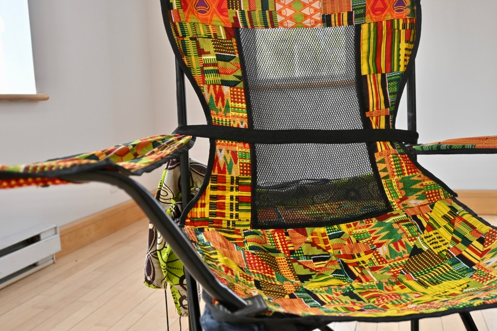 C’est dans cet esprit que Colas Eko a confectionné de l’équipement de camping à partir de tissus recyclés provenant de vêtements ou de nappes en pagne wax et bazin. Chargées d’histoires, ces étoffes ont été utilisées lors d’événements familiaux. D’origine et de production européennes, ces tissus sont associés et appropriés aux mœurs d’Afrique centrale et d’Ouest. Cette dichotomie ethno-esthétique nourrit le processus de réflexion abordé dans cette exposition. Il relève de la volonté de Colas Eko d’évoquer, avec la technique du patchwork, la fragmentation culturelle que subit le symbole du plein air dans l’inconscient et tente, avec l’usage de tissus recyclés, de diversifier ce récit.